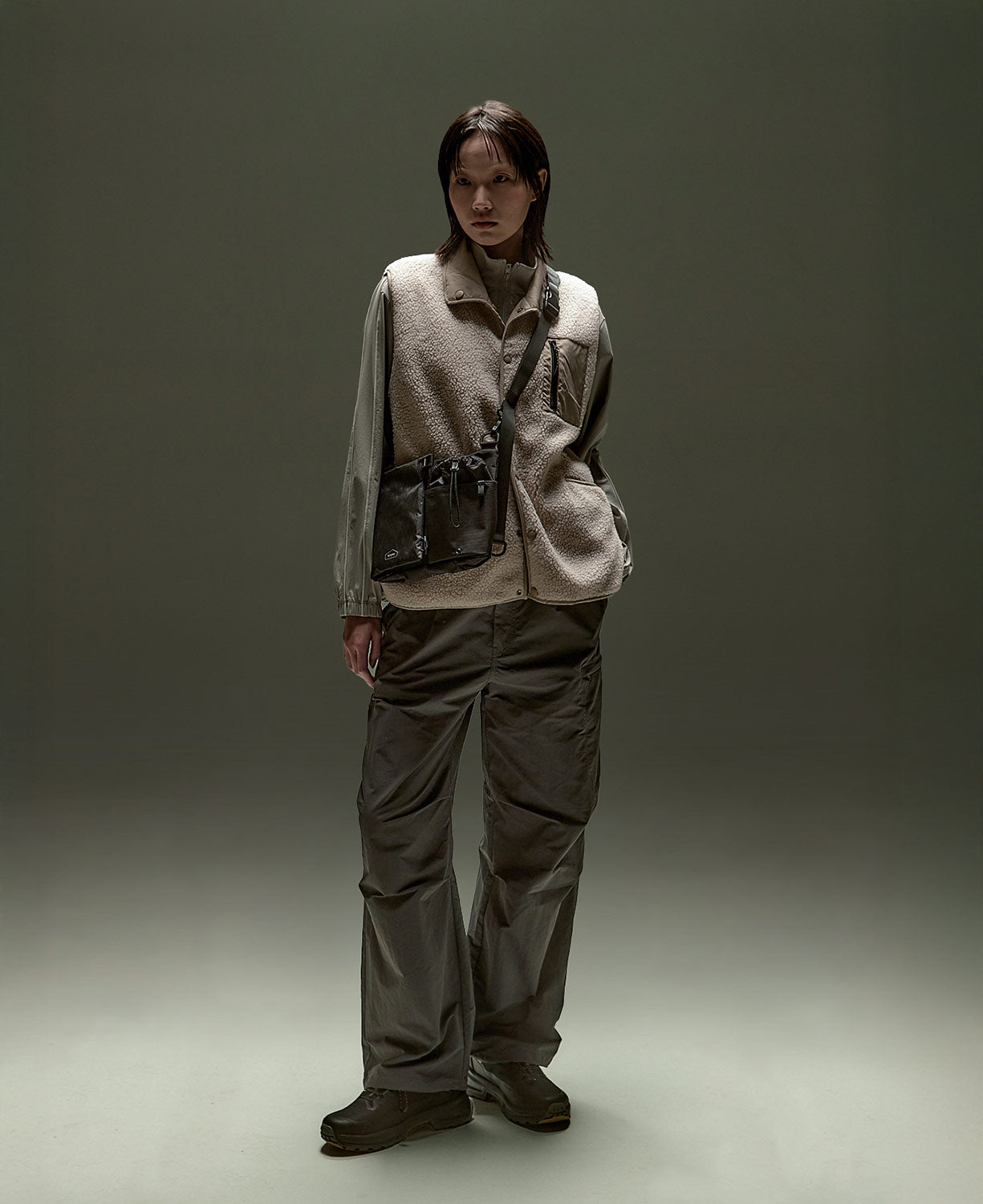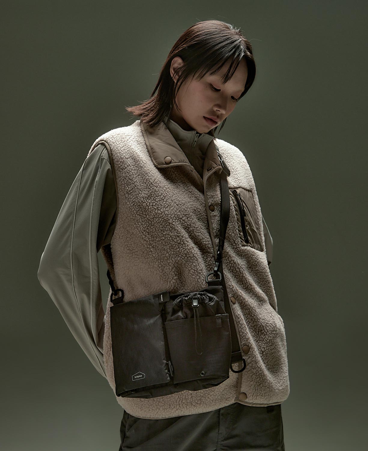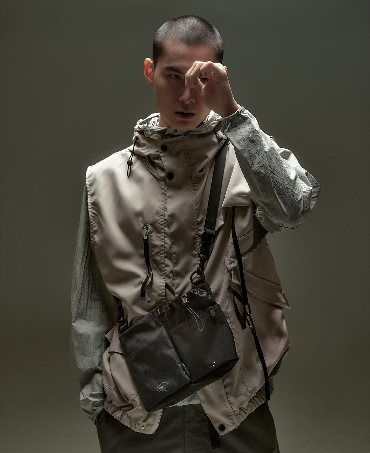 右側束繩袋可輕鬆收納水壺或雨傘,束繩袋底部設有雞眼設計,方便排水。左開式蓋片採用 Fidlock® 磁扣快扣固定,開闔便捷、穩固保護包袋內部物品。包袋內直式拉鍊袋為重要物品和護照收納空間,蓋片內織帶可收納筆、鑰匙及AirPods 等小物。內側還設有兩個開放式插槽及一個內翻式口袋,適合放置藥膏等輕便物品。蓋片右下角的彈性繩與包體牛角扣相扣,進一步提升收納安全。包體內部配有兩個壓扣口袋,提升收納靈活性。包袋整體採用防水面料拼接,不僅提升耐用性,更為整體造型增色。
