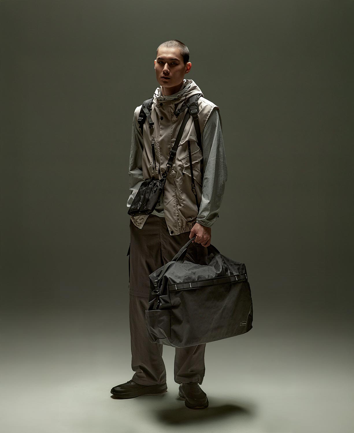 包袋採用兩側扣件設計,可快速收束空間。上方蓋片兼具防盜功能與收束手提把用途,左右兩端突起的織帶則可作為連接背帶的固定點。內部設有兩個網袋,方便分類收納物品,拉鍊頭集中於中間位置,方便每一次開啟。包袋兩側配有彈性開放式口袋,提供臨時收納空間。正面寬織帶可固定於行李箱拉桿,提升旅行便利性。