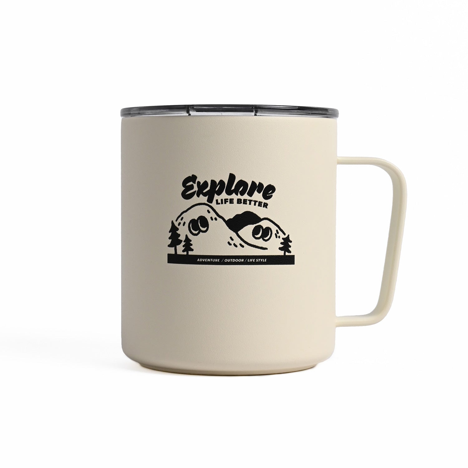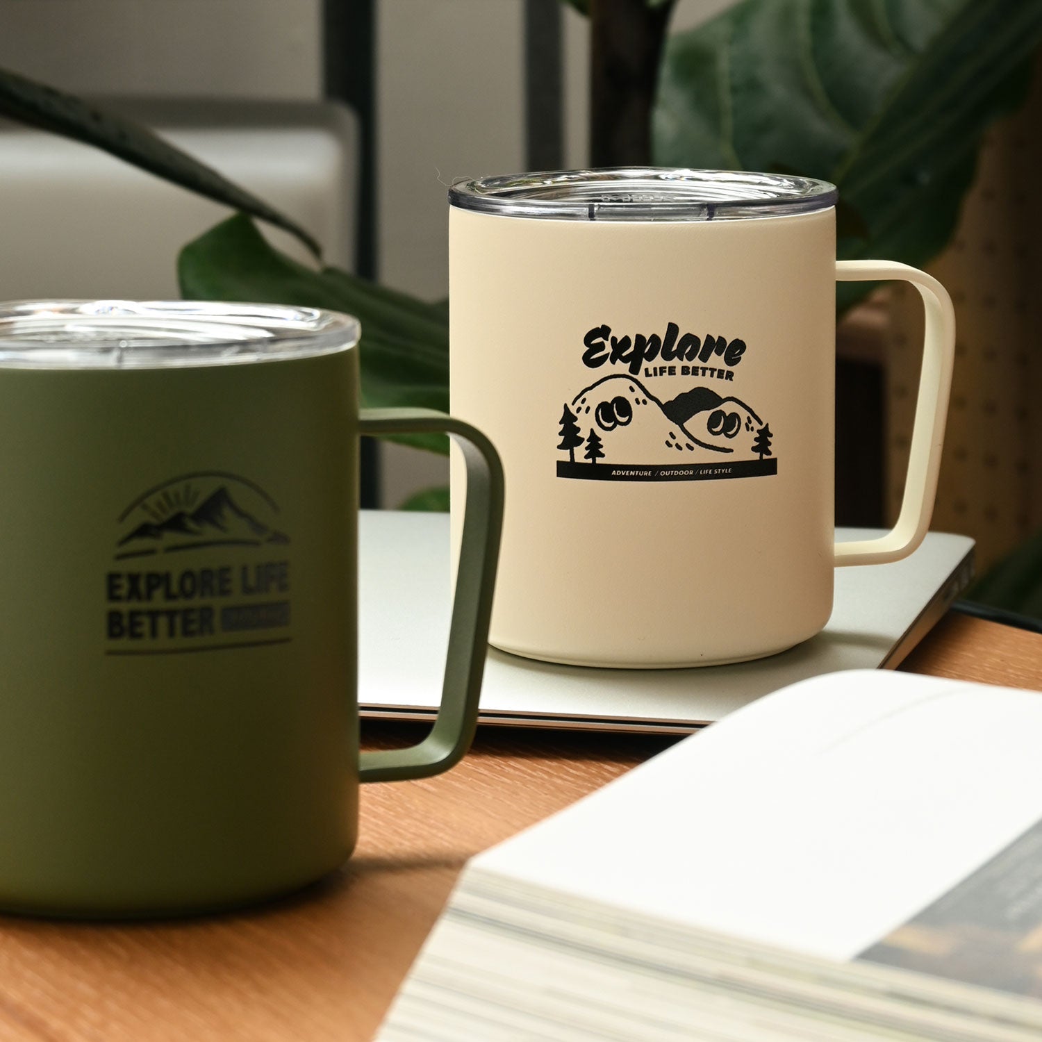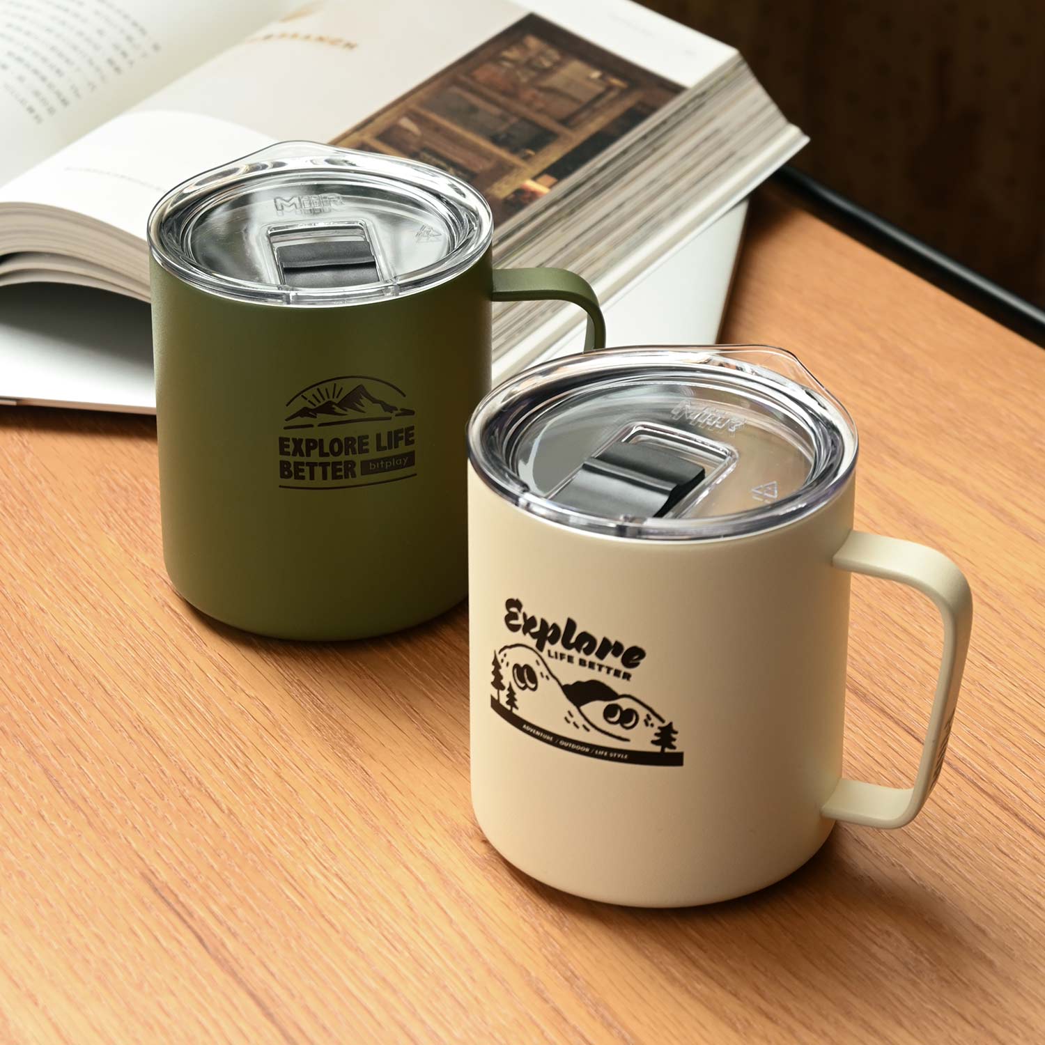 bitplay這次依據品牌風格,推出兩款與MiiR聯名的保溫馬克杯:軍綠色標語款,較有帥氣的戶外軍用 氛圍 ; 岩灰色為特製插畫款,將山丘擬人化,增添可愛幽默的氣息。