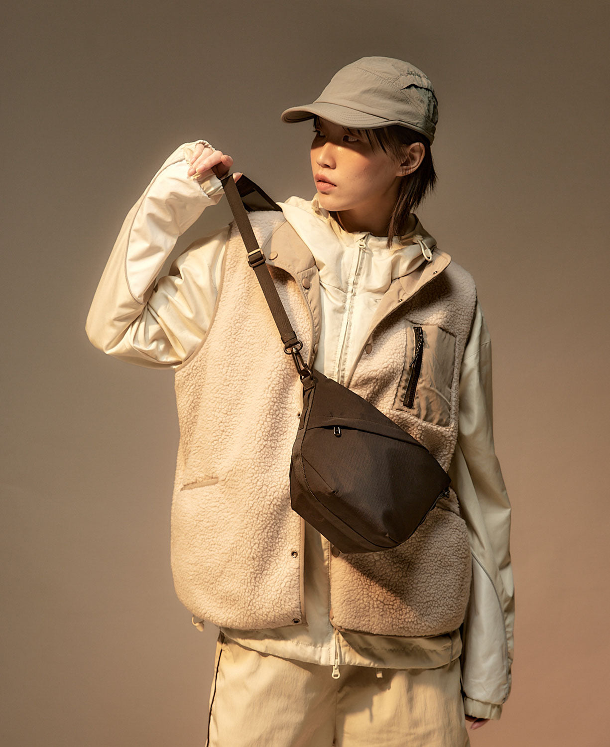 內襯採用多層填充設計,為相機提供全面防撞保護,內部貼式口袋則讓鏡頭蓋、記憶卡與電池分區收納,避免刮傷與碰撞。正面斜口袋具備防水擋片,適合放置電池或日常小物。包袋本身為磁吸開合方便取用物品,包袋上方開口可折束緊閉,防盜與防水功能兼具。背面短提把採用TPU加厚材質,手感舒適且耐用,不需要使用時可收納於隱藏式口袋內。包體外圍設有半圈織帶掛點,提升穩定性,並附TPU掛點,方便懸掛吊飾或耳機,滿足多樣需求。背帶設計提供兩種款式:黑色款搭配減壓網布背帶,透氣排汗且穩固舒適;杏色款則採用圈圈背帶,展現俏皮可愛的風格,兩者均可自由調節,提供多種背負方式。