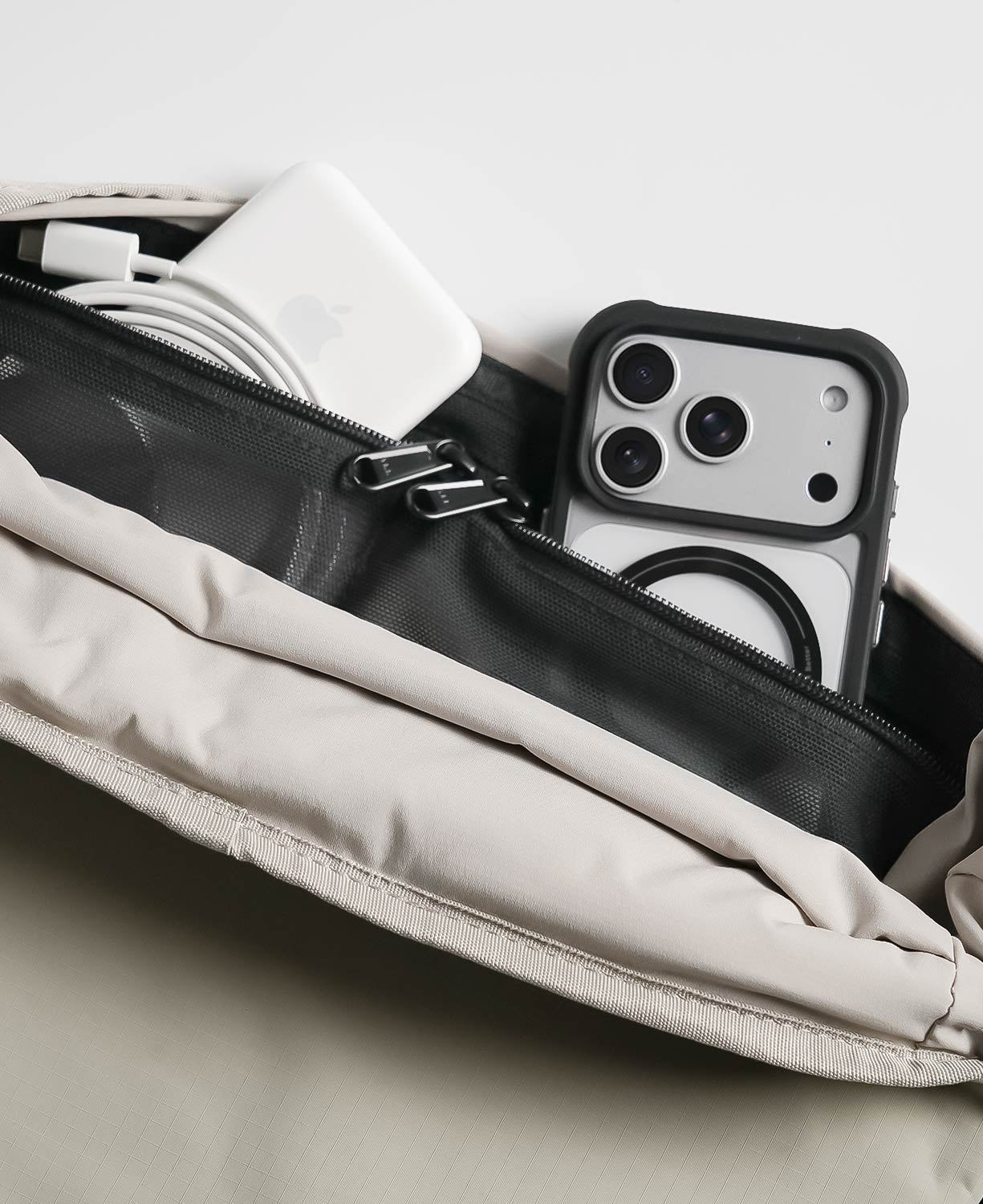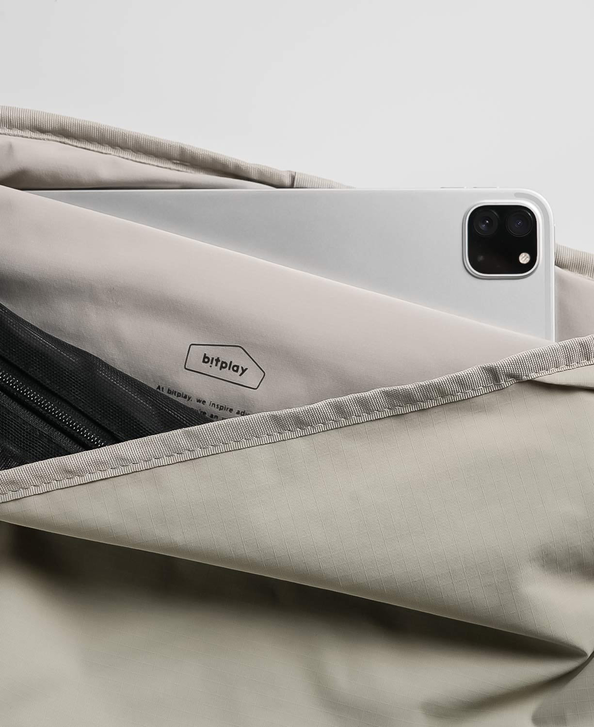 內層設有鋪棉隔層,可安全容納最大 12.9 吋 iPad,並具備抗靜電、緩衝保護等功能,為日常 3C 提供專業級保護。多隔層收納包含雙向拉鍊主袋、網袋分隔,以及背面防潑水拉鍊口袋,可妥善安放鑰匙、錢包、耳機與手機等隨身貴重物品。